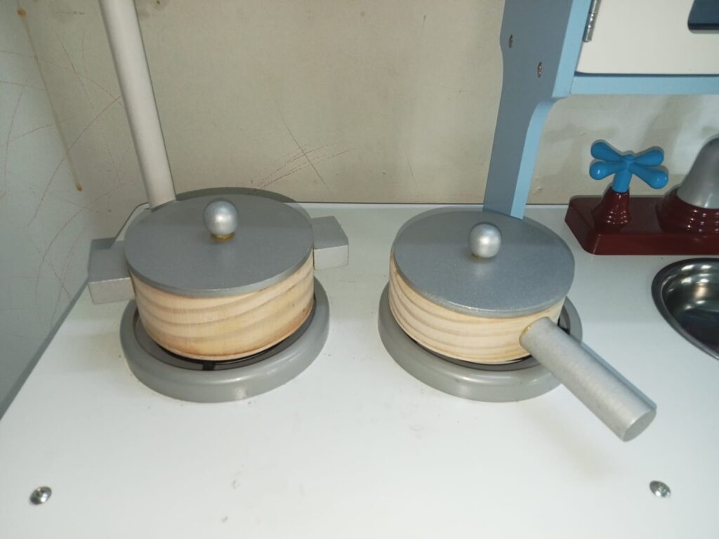 It also has 2 wooden pot and pan with lid which I guess is enough for the range those are quite big enough for her to handle and made of good quality wood.